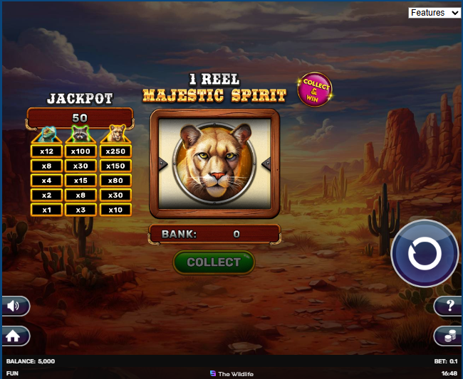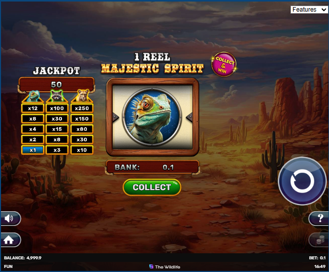 The interplay of symbols is where 1 Reel – Majestic Spirit truly distinguishes itself. The three primary animal symbols are not just win triggers; they are the engines of progression. As a player lands, for example, the fox symbol, its progress bar fills. Each filled segment on a progress bar corresponds to a multiplier increase for that symbol. These multipliers are clearly displayed on the left side of the screen, showing a tiered structure of win amounts ranging from x1 up to a significant x12 for the fox, x3 for the lizard, and x30 for the cougar. Reaching the final level of a progress bar means that any subsequent landing of that specific symbol will award the final win amount directly, bypassing the need for a “Collect” action and bypassing the bank entirely.