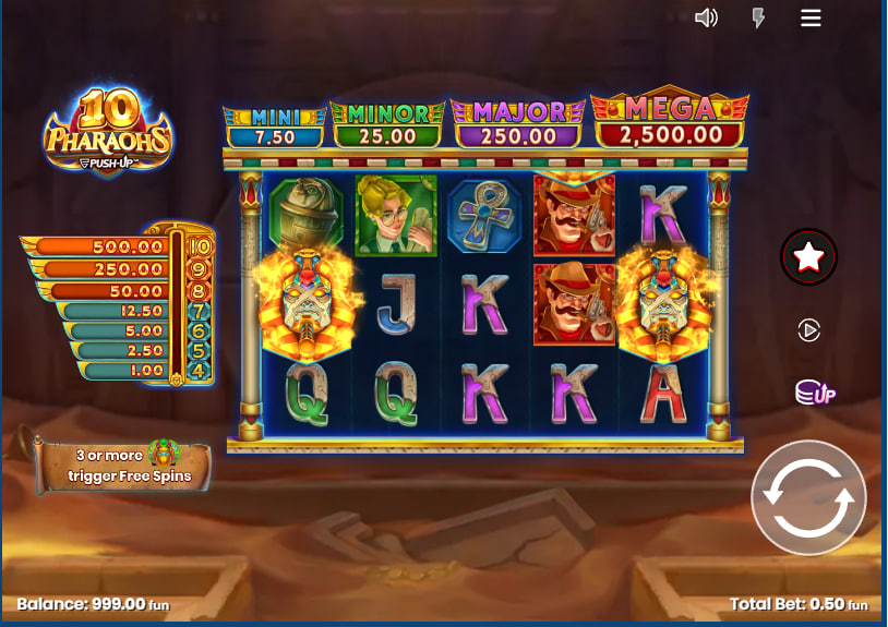 A significant portion of “10 Pharaohs'” unique appeal stems from its multi-faceted Pharaoh symbol mechanics. There are two primary types of Pharaoh symbols: the Standard Pharaoh and four distinct Jackpot Pharaohs (Mini, Minor, Major, Mega). The Standard Pharaoh symbol functions as a scatter-pay icon. Landing four or more of these symbols anywhere on the reels during the base game or Free Spins awards an Instant Prize. This prize scales with the number of Pharaohs landed, beginning at x2 the bet for four symbols and culminating in the aforementioned x1000 for ten symbols.