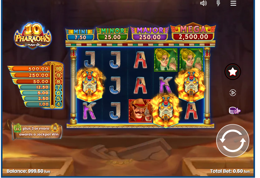 “10 Pharaohs” by Push Gaming distinguishes itself through carefully constructed symbol interactions and a feature-rich Free Spins round rather than thematic revolution. The dual-payout capability of the Pharaoh symbols, where Jackpot Pharaohs contribute to both their own fixed prizes and the cumulative scatter pays of Standard Pharaohs, is a sophisticated design choice. This creates multiple layers of anticipation on any spin where these critical symbols appear.