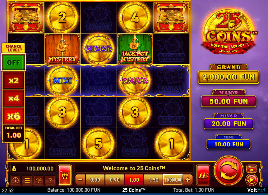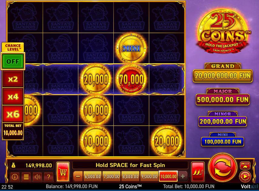 25 Coins™ Santa's Jackpots offers a Chance Level™ feature, allowing players to adjust their risk tolerance. Players can select a multiplier of x2, x4, or x6, directly influencing the odds of triggering the Hold the Jackpot™ Bonus Game. This presents a strategic choice: higher multipliers increase the chance of entering the bonus round, but at the cost of increased base game losses. This feature empowers the player to customize their gameplay experience.