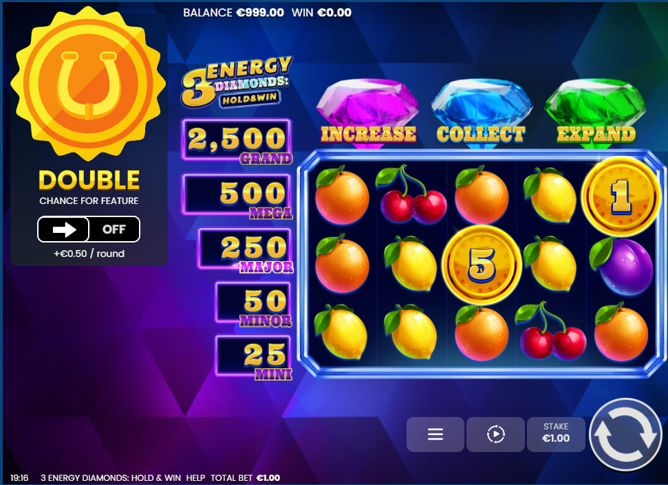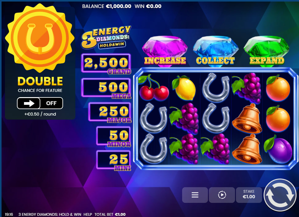 A notable mechanical element is the ‘Double Chance' feature, represented by a prominent gold horseshoe icon to the left of the reels. Activating this feature, at a slightly increased bet cost per spin, doubles the probability of triggering the in-game feature – referring primarily to the Hold & Win bonus. This option provides players with a direct choice: a standard bet with a base trigger chance, or an increased bet for enhanced feature frequency. This element of player agency over feature probability is a somewhat unusual, though potentially appealing, addition. The game controls are intuitive and clearly presented. Stake adjustment, spin initiation, autoplay settings, and access to the paytable and game rules are all readily accessible via clearly marked buttons on the game interface. The game also includes a ‘Fast Play' option, enabling quicker reel spins for players who prefer a faster pace of play. Overall, 3 Energy Diamonds utilizes a fundamentally simple and well-understood reel and payline structure as a foundation, layering more complex and engaging elements – particularly the Hold & Win feature and progressive jackpots – on top. This combination of classic mechanics with modern feature enhancements is a key aspect of its design, aiming to appeal to both players who appreciate traditional slot gameplay and those seeking more feature-rich and dynamic experiences.