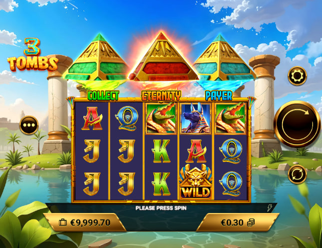 The central innovation within “3 Tombs” lies in its Pin Win Bonus system, which is intricately linked to three distinct pyramids positioned above the main reel set: a Green (Collect) pyramid, a Red (Eternity) pyramid, and a Blue (Payer) pyramid. Activation of these bonuses is not through a standard scatter mechanism but via Scarabs that can randomly overlay symbols on the reels.
