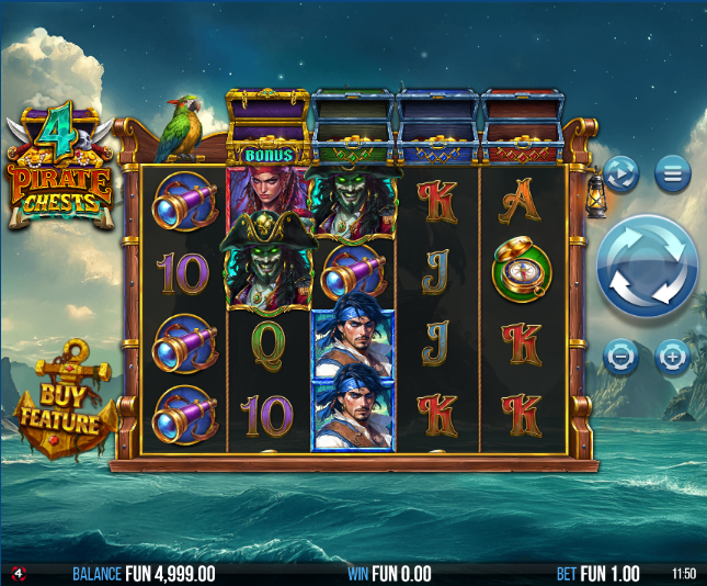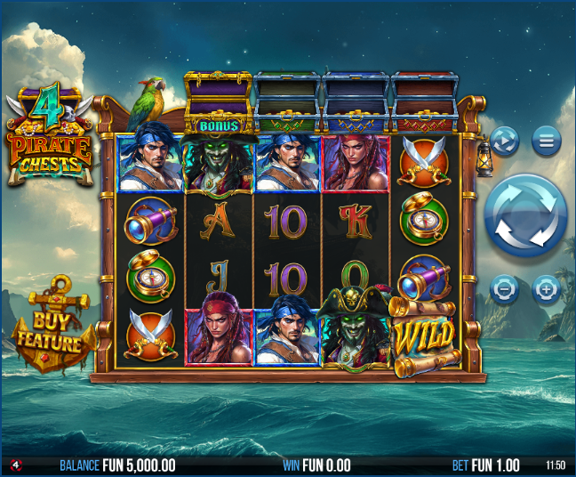 The inclusion of the “Buy Feature” option caters to a modern player base that appreciates direct access to bonus rounds, adding another layer of strategic choice. For experienced players who are familiar with common slot tropes, “4 Pirate Chests” offers a refreshing experience that rewards attentive play and strategic betting. The game strikes a fine balance between providing consistent wins through its base game mechanics and offering significant upside potential through its carefully designed bonus rounds.