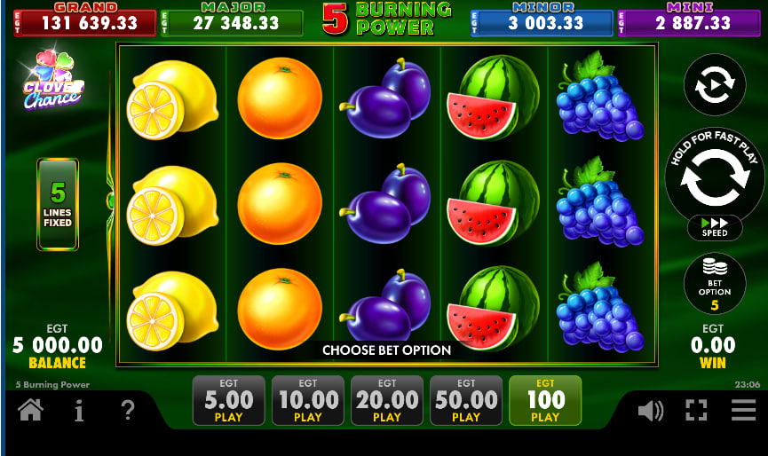 EGT Digital’s 5 Burning Power offers a direct approach to classic slot entertainment, centered around a traditional fruit theme infused with lucky clover elements. The game presents its vibrant symbols on a straightforward 5×3 reel structure, utilizing 5 fixed paylines for win generation. Core gameplay features the iconic Four-Leaf Clover as an expanding Wild on the central reels, significantly enhancing winning possibilities. Dual Scatter symbols, the Dollar Sign and Purple Star, provide payouts independent of payline alignment, adding another dimension to potential returns. The standout attraction is the randomly triggered, four-tier Clover Chance progressive jackpot, a pick-and-win game involving chests and level-up symbols. A classic card-based Gamble option also allows players to risk winnings for a chance to double them. This title appeals to players valuing clear mechanics and the pursuit of substantial progressive prizes.