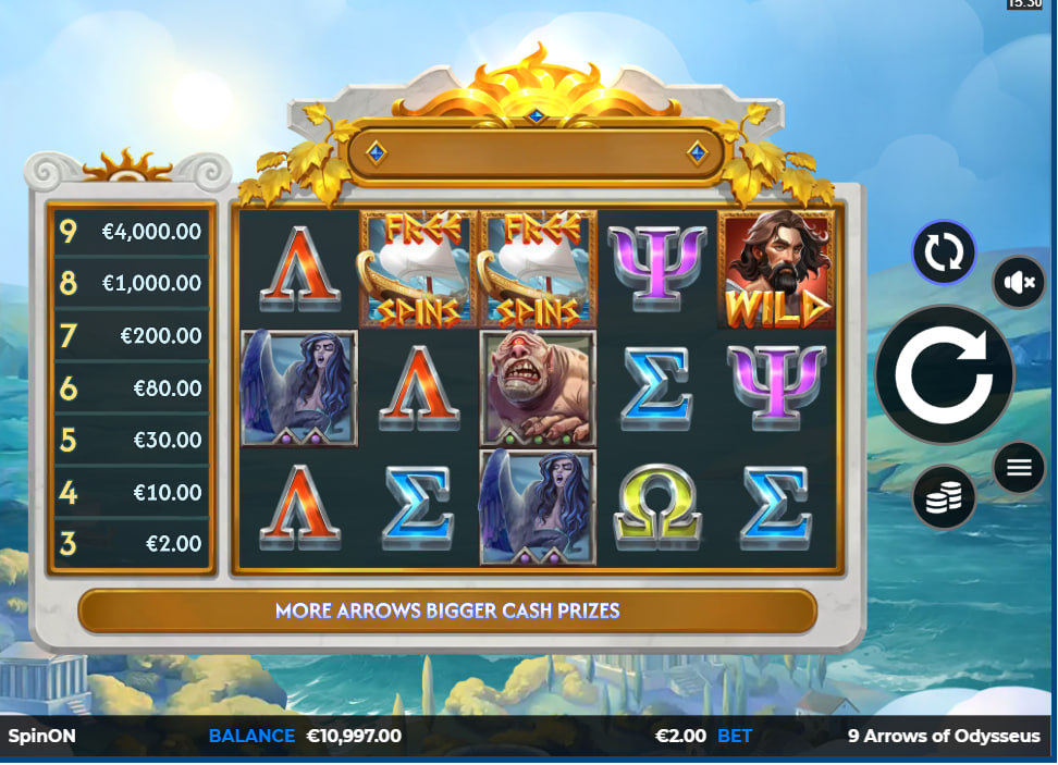 SpinOn brings the epic tales of Greek mythology to the reels with “9 Arrows of Odysseus.” While the Hellenic theme is a familiar sight in the world of online slots, this title distinguishes itself primarily through its central Arrow Scatter Pay feature, a persistent mechanic offering direct cash awards based on symbol count, visible directly alongside the reels. Coupled with a multi-option Free Spins Bonus determined by a pre-round wheel, the game presents a structure that warrants detailed examination for players seeking engaging free slot experiences or those evaluating mechanics before potential real-money sessions. Developed by SpinOn, the game attempts to carve a niche within a popular genre.