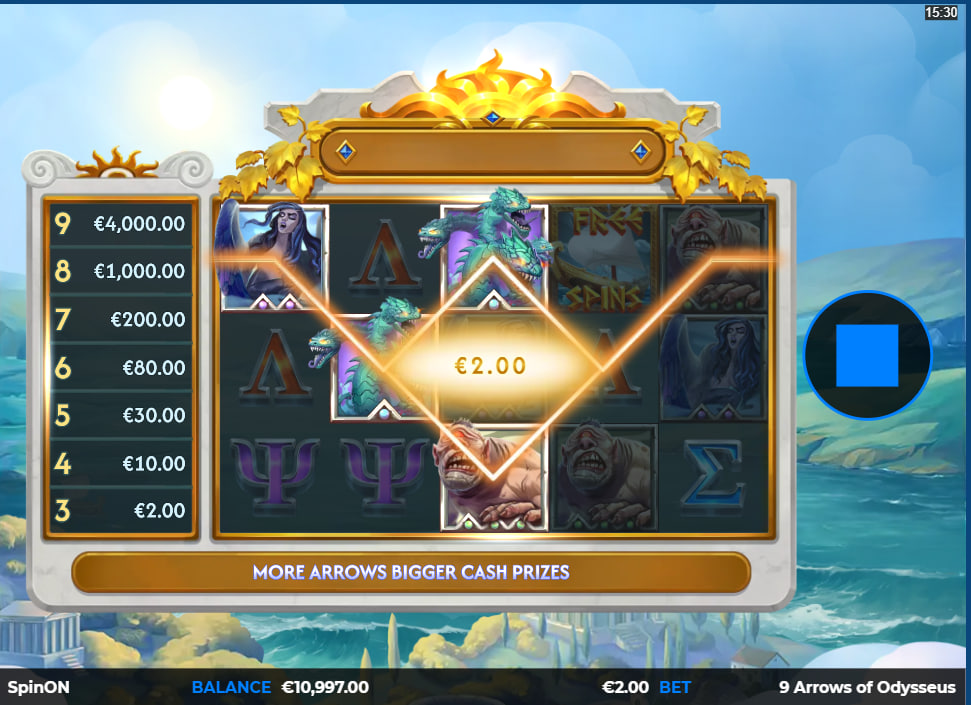 The gameplay rhythm of “9 Arrows of Odysseus” is significantly influenced by the interplay between standard payline wins and the ever-present Arrow Scatter Pay feature. The potential for instant cash prizes from the Arrows adds volatility and excitement to the base game, preventing it from becoming solely reliant on triggering the Free Spins round. Players might find themselves focusing as much on the count of Arrow symbols as on lining up traditional combinations. The Mixed Pays mechanic for high symbols provides small, but potentially frequent, wins that can help sustain gameplay.