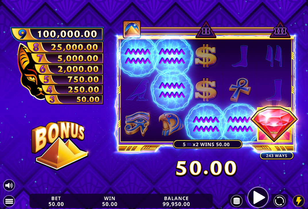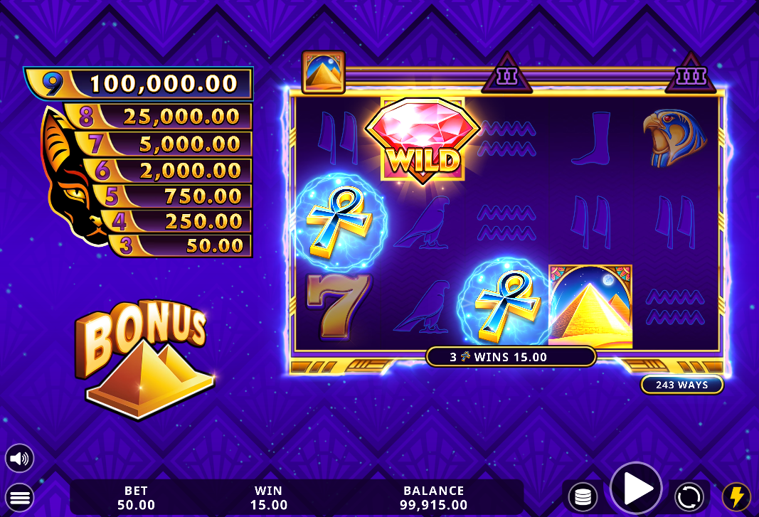 - Free Spins: 5, 7, or 9 free spins for 3, 4, or 5 pyramid symbols