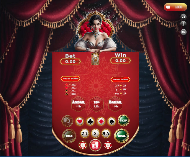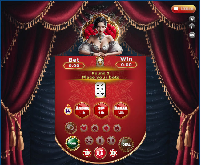 GameTimeTec's interpretation of Andar Bahar presents a familiar card game through a lens of expanded strategic choice. The game bypasses elaborate narrative themes, instead grounding itself in a classic, almost theatrical casino environment. Rich, red velvet curtains frame the playing area, and a composed hostess figure presides over the action, creating an atmosphere of a private, high-stakes table. This visual restraint serves a purpose: it directs the player's entire focus to the game's most significant feature—a two-phase betting structure that transforms a simple game of chance into a more calculated exercise in risk management.