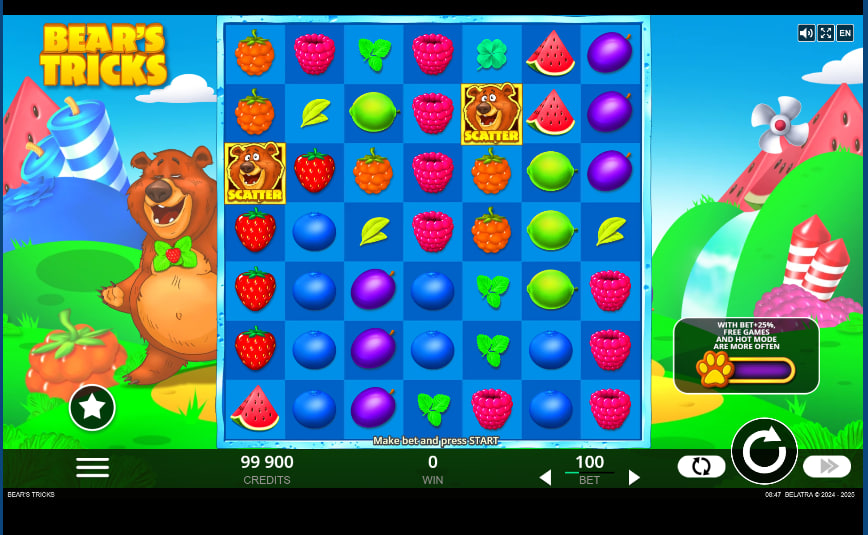 Belatra understands that some players prefer direct access to the game's most lucrative features, which is why “Bear's Tricks” offers both a BET+25% option and a comprehensive Buy Bonus menu. The BET+25% feature allows players to increase their current wager by 25%. In exchange for this elevated stake, the game significantly increases the frequency of triggering Free Games and Hot Mode. An important operational detail is that while the bet is higher, any winnings generated are still calculated and multiplied by the original base bet, not the augmented 25% value. This nuance requires careful consideration for players managing their bankroll and understanding the true cost-benefit ratio of this feature, as it primarily affects the hit rate of bonus rounds.