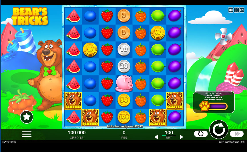 Belatra Games introduces “Bear's Tricks,” a vibrant online slot that distinguishes itself within the crowded landscape of grid-based games. This title presents players with a visually engaging 7×7 grid, diverging from traditional reel structures to employ a Cluster Pays system. The game's setting is a cheerful, cartoonish picnic scene, replete with juicy fruits and a jovial bear, establishing a lighthearted ambiance. This design choice, while seemingly whimsical, underpins a complex and highly volatile gameplay experience, crafted for the seasoned slot enthusiast seeking intricate mechanics beyond mere aesthetics.