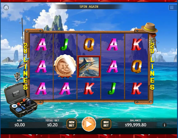 KA Gaming casts its line into the popular fishing-themed slot genre with “Big Catch Lock 2 Spin.” This title presents a familiar marine backdrop, with sun-drenched waters and distant rocky outcrops framing the game grid. The visual execution is straightforward, favoring clarity over elaborate animation. The reel housing itself is depicted as a wooden frame, adorned with fishing tackle, reinforcing the angling motif. The overall atmosphere is one of a calm day out on the water, aiming for a relaxing rather than an overly stimulating visual experience.
