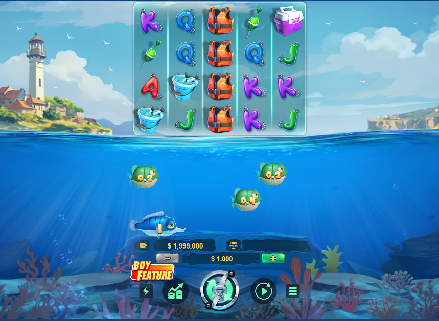 Advantplay's execution of the fishing theme is thoughtful and well-realized. The visual design opts for a cheerful, almost idyllic atmosphere over gritty realism. The background depicts a peaceful coastal town with a prominent lighthouse, set against a bright blue sky with gently drifting clouds. This serene overworld contrasts effectively with the vibrant, active underwater scene. The water itself is rendered with a sense of depth, with light rays piercing the surface and illuminating the marine life below. This split-screen presentation is the game's most impressive visual accomplishment, managing to display two distinct environments without feeling cluttered or confusing.