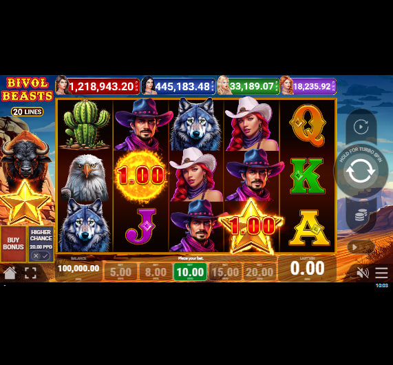 The foundational structure of “Bivol Beasts” is built upon a 5×3 reel setup, accommodating 20 fixed paylines. The gameplay loop is designed for clarity, with winning combinations formed by landing three or more matching symbols from left to right across active lines. The symbol hierarchy is standard, with premium symbols like the male cowboy and female cowgirl offering the highest payouts, followed by the wolf and eagle. Lower-paying symbols consist of stylized card ranks (A, K, Q, J), rendered with a touch of Western flair.