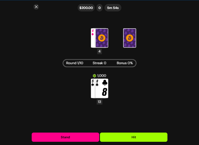 The gameโs aesthetic is decidedly minimalist and modern. It operates on a stark black background, which allows the key game elements to stand out with high contrast. The action buttonsโ”Hit” and “Stand”โutilize vibrant neon colors, typically a bright green and a hot pink, making player choices clear and immediate. This visual language avoids the ornate, skeuomorphic designs of traditional casino simulations, opting for a clean, digital, and almost abstract presentation. The playing cards themselves are clean and legible, though the card backs feature a stylized Bitcoin logo, hinting at the provider's background in crypto-integrated gaming.