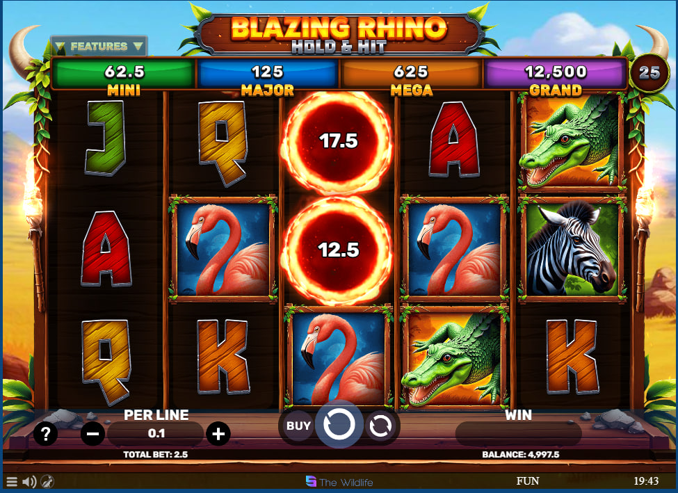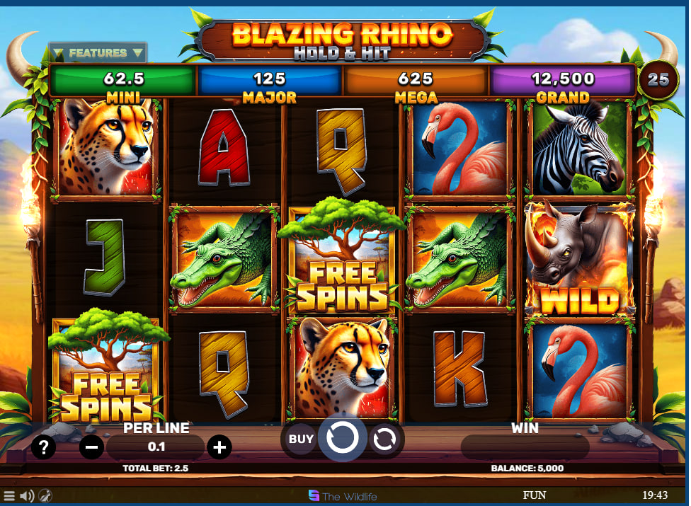 Blazing Rhino Hold & Hit immerses players in the African savanna, populated with cheetahs, zebras, flamingos, and crocodiles alongside the powerful rhino wild symbol. Developed by Spinomenal, this slot features a 5×3 layout with 25 paylines. The core game revolves around triggering the Hold & Hit Bonus, activated by six bonus symbols, offering respins, multipliers, and fixed jackpots. Free spins introduce colossal 3×3 symbols, enhancing win potential. The savanna theme is visually bright and cartoonish, supported by engaging sound effects and music. Players looking for a safari-themed slot with dynamic bonus action might find Blazing Rhino Hold & Hit appealing.