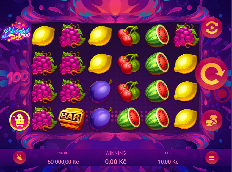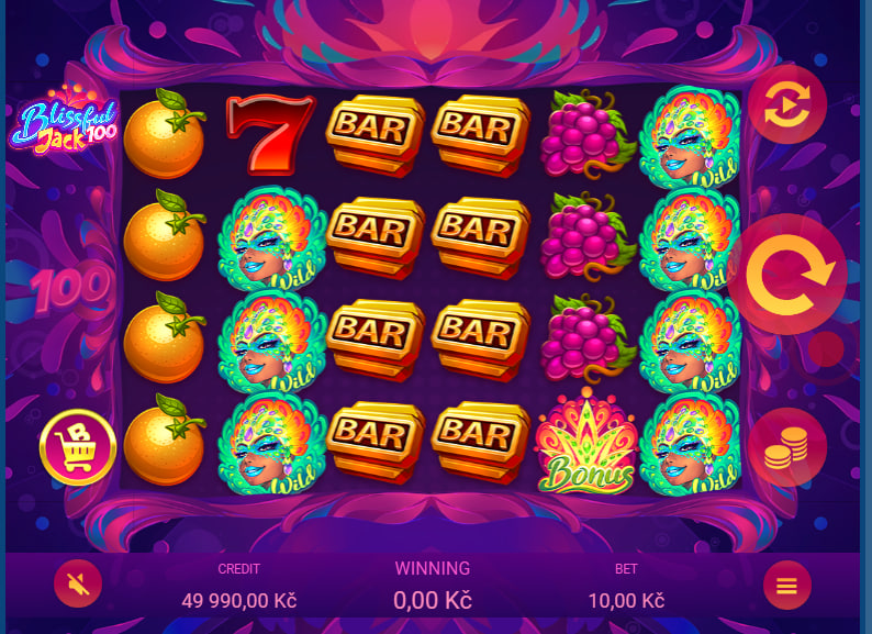 The visual presentation of Blissful Jack 100 is direct and functional, utilizing a rich purple backdrop against which brightly rendered symbols stand out. The thematic overlay leans towards a festive, Mardi Gras-esque carnival, primarily conveyed through the Wild symbol โ a colorfully adorned carnival-goer โ and the intricately designed Bonus and Mystery symbols. These elements provide a pleasant contrast to the more traditional fruit symbols (cherries, lemons, oranges, plums, grapes, watermelons) and the classic slot stalwarts like BARs and 7s.