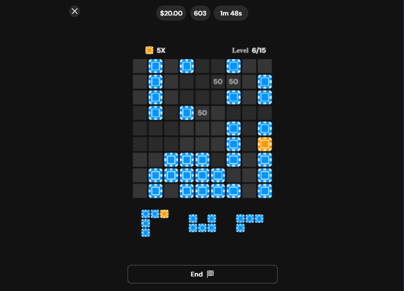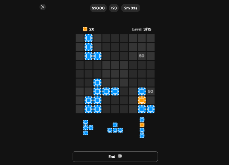 The aesthetic of Blocks is one of stark functionalism. There are no elaborate backdrops, character animations, or distracting visual effects. The entire focus is on the dark gray grid, the vibrant blue player shapes, the orange multiplier blocks, and the numbered Point Tiles. This minimalist approach is a deliberate design choice that serves the gameplay directly. By removing all superfluous visual information, the game allows players to concentrate entirely on the puzzle at handโthe spatial relationships between the shapes and the empty cells on the board. The color-coding is clear and immediate, allowing for rapid identification of critical game pieces without ambiguity.