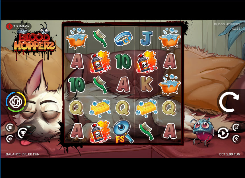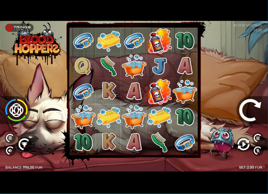 7Rings Gaming presents a peculiar and somewhat grotesque visual concept in Blood Hoppers 2. The setting is a microscopic battleground staged on the back of a blissfully unaware, sleeping dog. This game sidesteps common fantasy or mythological themes in favor of a cartoonish pest problem. The art style evokes a late-90s animated series, with bold lines and exaggerated character design for the fleas. The reels are populated with symbols that create a deliberate thematic clash: high-value icons are items of pet grooming like a flea comb, a bar of soap, and a tub of suds, while the true antagonistsโthe fleasโironically function as the player's greatest allies.