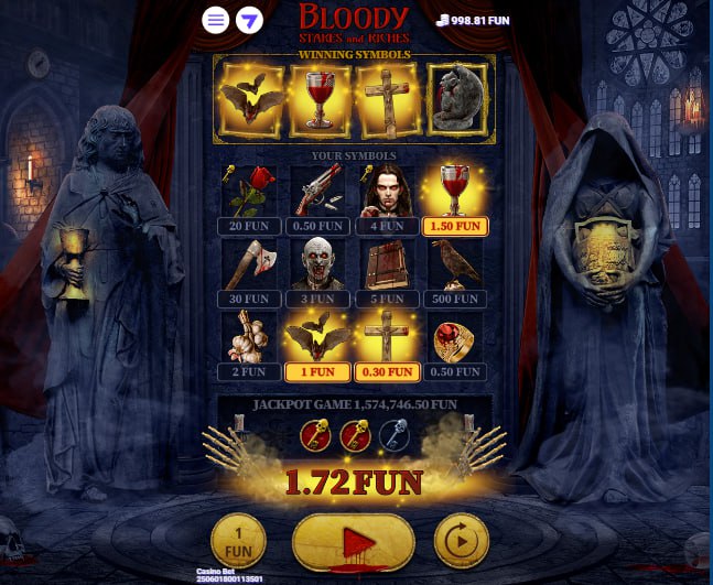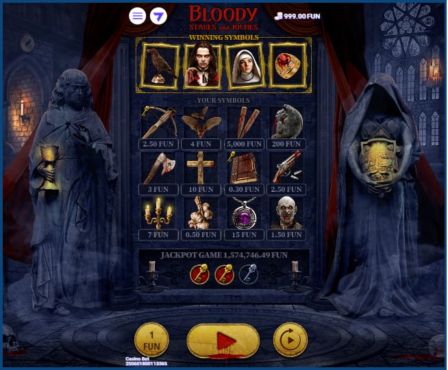 Rather than lining up symbols on paylines, players in Bloody Stakes and Riches seek matches between a set of “Winning Symbols” and their own hidden “YOUR SYMBOLS.” This simple core mechanic is the foundation upon which the game builds its thematic depth and feature set. The visual presentation immediately establishes a somber, atmospheric world, inviting players who appreciate dark fantasy and lore surrounding vampires and their hunters. It's a game that values direct action and straightforward results, yet it incorporates elements designed to build suspense and offer more complex objectives beyond the base win, specifically through its unique bonus game and the coveted progressive jackpot opportunity tied to it. This blend of instant outcome and feature chase distinguishes it within the online gaming landscape, offering a different pace and structure compared to typical video slots available for free play online.