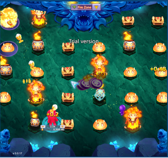 The game's atmosphere is one of energetic, almost chaotic, aquatic skirmishes. Visually, it employs a bright, cartoonish aesthetic. Targets range from amorphous, blob-like creatures to more defined entities like treasure chests and what appear to be animated, fiery totems or barrels. The backdrop shifts depending on the selected “Zone” or “Lobby,” as indicated by the lobby selection screen, moving from a wooden deck in what might be a standard or “Fire Zone” to a more ethereal, crystalline environment possibly representing an “Electric Zone” or a special boss arena. The overall impression is less of a contemplative casino game and more akin to an engaging arcade shooter, designed to keep the player actively involved.