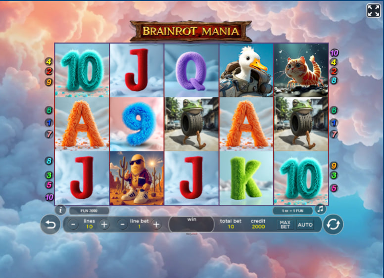 At its heart, “Brainrot Mania” operates on a classic 5-reel, 3-row structure with a fixed 10 paylines. The objective is straightforward: land matching symbols from left to right across any of these active lines. The paytable, easily accessible through the game's information screen, clearly delineates the value of each symbol. As expected, the high-paying symbols are the game's unique characters, with the duck astronaut commanding the highest payout. Landing five of these futuristic fowl on a payline results in a substantial win, acting as the game's jackpot. The shark and the alligator also offer respectable returns, followed by the slightly more mundane, yet still visually distinct, characters like the desert-dwelling man and the peculiar tire creature.