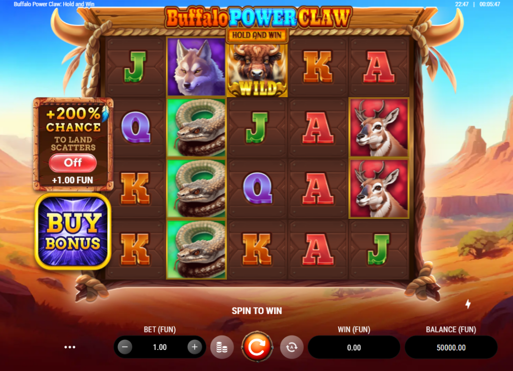 Buffalo Power Claw introduces an innovative mechanical twist to the wildlife slot genre. This Clawbuster creation operates on a 5×4 grid with 50 fixed paylines, featuring North American fauna symbols and a unique Hold & Win bonus system. The game’s signature mechanic involves expanding Claw Reels that can merge to form larger grabbing zones with progressive multipliers. Players can trigger the bonus through natural gameplay or choose from three Bonus Buy options. The Hold & Win feature begins with three respins and includes Mystery Boxes offering various enhancements. Stacked Wilds appear 2-4 symbols high during base game play. The maximum win potential reaches 6992x the stake, making this slot appealing to high-volatility enthusiasts.