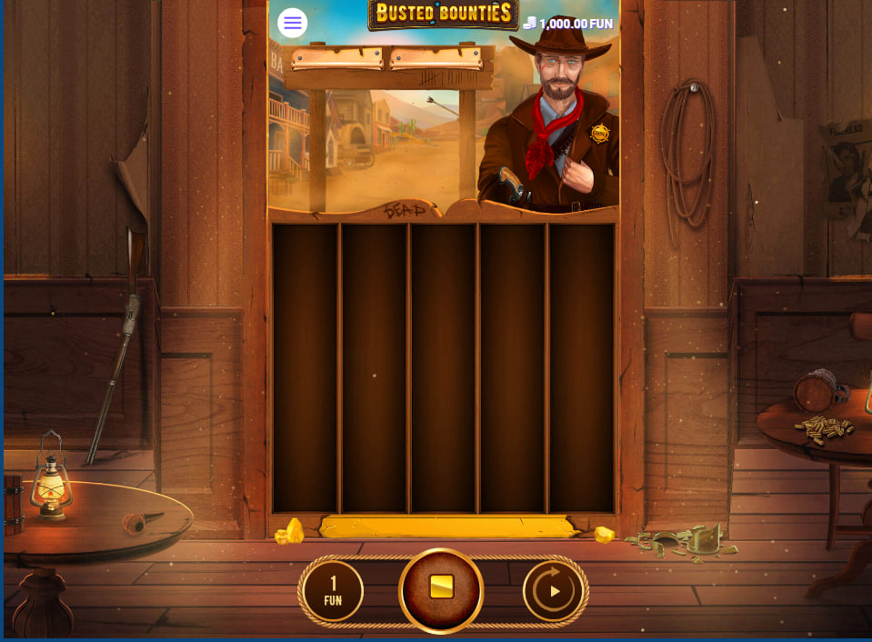 The visual presentation of “Busted Bounties” effectively establishes its Wild West theme. The game unfolds within a rustic saloon interior, conveyed through a detailed wooden backdrop. Elements such as a rifle leaning against the wall, a flickering lantern casting warm light, a worn wooden table strewn with playing cards and a mug, and a lasso hanging beside a faded “wanted” poster all contribute to the atmosphere. These details arenโt just static background elements; they actively enrich the gaming environment, creating a more immersive and themed experience.