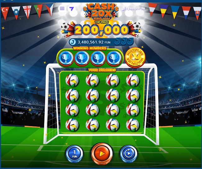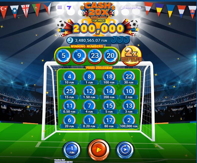 At its heart, Cash 20x Euro 2024 operates on a simple yet engaging premise: players select a bet amount, initiating a round where a set of ‘Winning Numbers' and a multiplier potential are determined. These are displayed prominently at the top of the interface. Below, a grid of soccer balls conceals ‘Your Numbers'. The player's objective is to reveal ‘Your Numbers' and see how many match the ‘Winning Numbers'. The number of matches directly correlates to a prize multiplier, as outlined in the game's paytable.