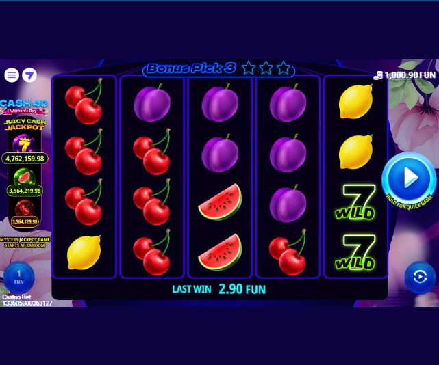 7777 gaming’s Cash 40 slot presents a modern interpretation of the classic fruit machine theme. The game sets its high-gloss fruit and ‘7’ symbols against a dynamic, blurred city night backdrop, creating a contemporary atmosphere without abandoning its traditional roots. It operates on a 5×4 grid with 40 fixed paylines, establishing a familiar foundation for its more intricate features. At its core, gameplay is driven by the ‘7’ symbol, which serves a dual role as both the highest paying icon and a Wild substitute. A random multiplier reel, offering up to 100x, can activate on any Wild-assisted win, injecting significant volatility into the base game. The main Bonus Feature, a ‘Pick 9’ instant prize game, requires landing three Star Scatters within a single reel column—a notable departure from standard mechanics. Inside this feature, players uncover cash prizes while seeking Golden Coins to trigger the Juicy Cash progressive jackpot. The game’s theoretical RTP shows a complex structure, with a base game return of 94.01% and a bonus-specific RTP of 95.73%, appealing to players who analyze sophisticated slot designs.