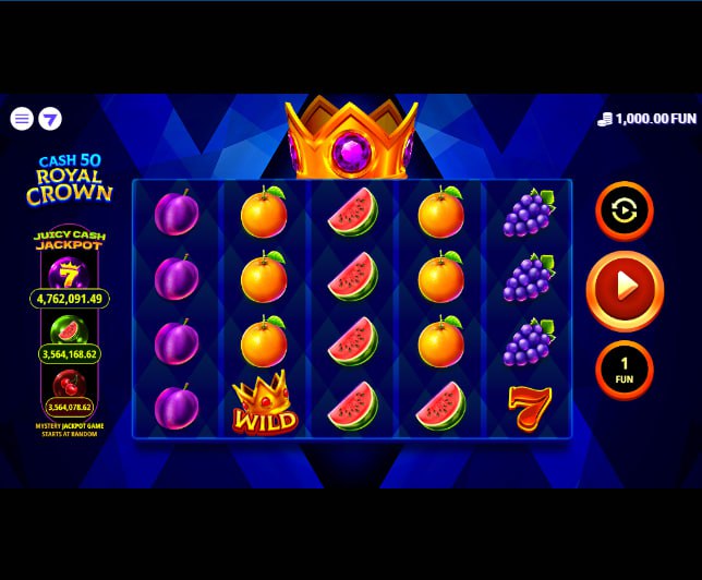 Cash 50 Royal Crown from 7777 gaming presents a refined vision of the classic fruit slot. It updates familiar symbols and atmosphere with a polished look, utilizing deep purple backgrounds and luxurious gold accents. Building on the long history of fruit machine designs, this slot introduces modern gameplay on a 5-reel, 4-row layout. The core game involves forming combinations across 50 fixed paylines from left to right. Enhancing payout potential are Stacked Wild symbols which can cover multiple positions. A unique Juicy Cash Jackpot feature offers separate rewards based on collecting special symbols during winning spins. Players may also use a classic Gamble function to potentially increase base game wins.