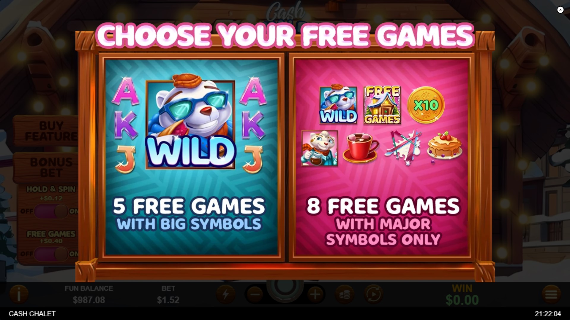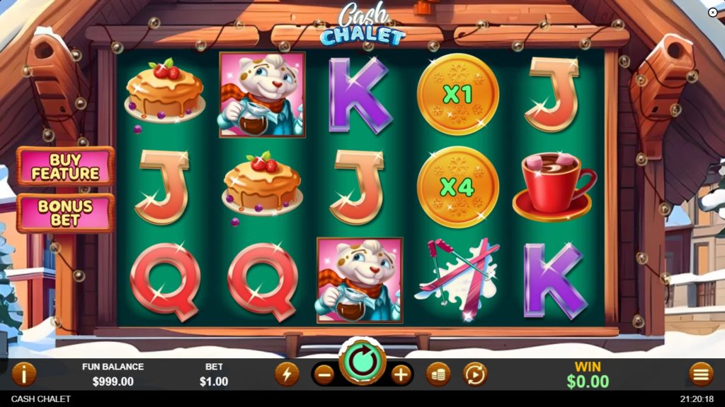 Cash Chalet is a winter-themed slot with a cozy ski lodge atmosphere. Symbols like the Polar Bear and Leopard, alongside coffee mugs and skis, create the ambiance of a mountain retreat. The 5×3 layout with 25 fixed paylines forms the core gameplay. Cash Chalet features medium volatility and offers a unique Hold & Spin bonus. This bonus transforms the layout into 15 independent reels with potential Mini, Minor, and Major jackpots. Cash Chalet also allows you to choose between two Free Games modes with Big or Major symbols. Oversized Scatter symbol may also lead to Hold & Spin Feature activation, if it appears during Free Games. The game’s strategic elements add a layer of complexity, as the players should decide whether to purchase a bonus feature or enhance the bet.