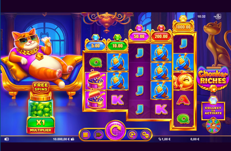 The main event is the Free Spins round, which itself is a multi-stage affair with a persistent element that carries over from the base game. Activation requires landing five Paw Bonus symbols in the base game, which awards an initial set of three free spins. Upon entry, the reel set transforms significantly. The standard paying symbols are removed, and the only symbols that can land are Blanks (non-paying blockers), Coin symbols, Collect symbols (on reel 5), Jar of Catnip symbols (on reel 5), and Extra Spin symbols (on reel 5). This shifts the gameplay into a hold-and-win style format where the objective is to land and collect cash values. The Extra Spin symbol, depicted as a cat with a “+1” on it, adds one additional spin to the remaining total, extending the feature. The critical component, however, is the Free Spins Multiplier. This multiplier has ten levels, starting at 1x and progressing through 1.5x, 2x, 2.5x, 3x, 4x, 5x, 6x, 8x, and finally capping at 10x. The multiplier level is increased by one step each time a Jar of Catnip symbol lands on reel 5 during the Free Spins. Crucially, progress on this multiplier track can also be made during the base game; collecting four Paw Bonus symbols before triggering the feature will advance the starting multiplier for the subsequent Free Spins round by one level. This creates a long-term objective for the player. The interaction between the base game collection and the in-bonus level-ups can be intricate. If the mechanics of the Free Spins Multiplier progression are not immediately clear, launching the Chonker Riches demo version and accessing the in-game help file (usually marked with an ‘i') provides a comprehensive breakdown from the developer.