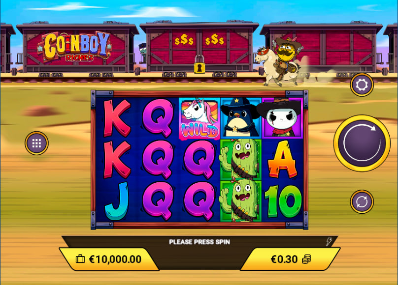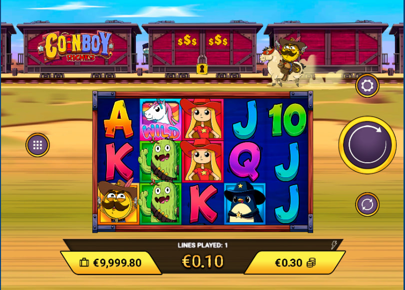 Amigo Gaming's Coinboy Riches presents a decidedly animated and unconventional rendition of the classic Wild West theme. Rather than opting for gritty realism, the game offers a vibrant, cartoon-inspired aesthetic. The visual narrative unfolds against a backdrop of a desert landscape with a speeding train above the main reel set, immediately hinting at an action-oriented experience. The character design is notably distinctive, featuring a protagonist Coinboy with a prominent golden-coin head and mustache, alongside a cast that includes a determined-looking cowgirl, a skeletal bandit, a surprisingly formal penguin sheriff, and a bandolier-wearing cactus. This playful approach extends to the overall atmosphere, which feels lighthearted and engaging, clearly aiming for entertainment through visual charm and thematic novelty.