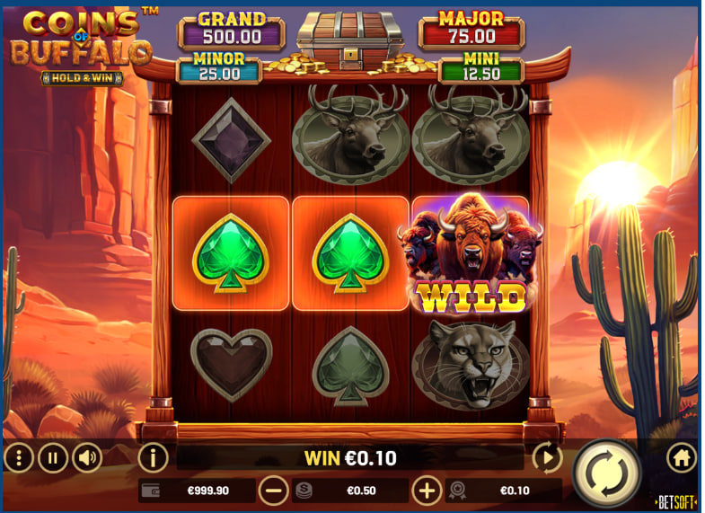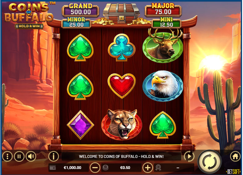 Immerse yourself in the rugged beauty of the American West with Betsoft’s “Coins of Buffalo – Hold & Win.” This 3-reel, 3-row slot unfolds against a stunning backdrop of desert canyons and cacti, bathed in the warm glow of a setting sun. The game centers around its compelling Hold & Win feature, a mechanic that offers significant winning potential. Triggered by landing Bonus symbols, including the crucial Buffalo Bonus symbol, players are granted respins where Bonus symbols lock in place, accumulating values. The chance to land Mini, Minor, Major, or Grand jackpots adds an exciting layer of anticipation. With 5 fixed paylines and a Wild symbol to aid in creating winning combinations, “Coins of Buffalo” provides a focused yet thrilling slot experience.