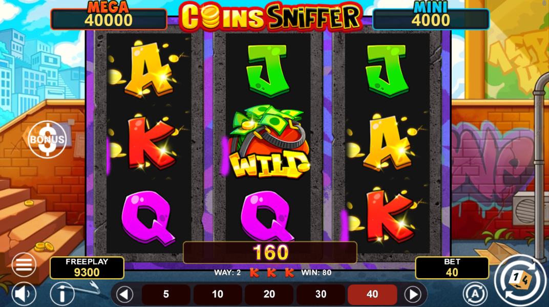 Coins Sniffer Hold and Win, created by 1spin4win, combines urban street art with a unique canine detective theme. This 27-payline slot features a streetwise dog searching for hidden treasures among vibrant graffiti backdrops. The game offers a high volatility experience with an impressive 97.1% RTP, complemented by a distinctive letter collection system that doubles wins. Its Hold and Win bonus round provides three respins with two jackpot opportunities – a Mini Jackpot at x100 and a Megapot at x1000. The money bag Wild symbol enhances winning potential by substituting for all symbols except Coins. Players can wager between €0.01 and €50, with maximum wins reaching 1500x the bet. A Buy Bonus feature provides direct access to the bonus game for those seeking immediate action.