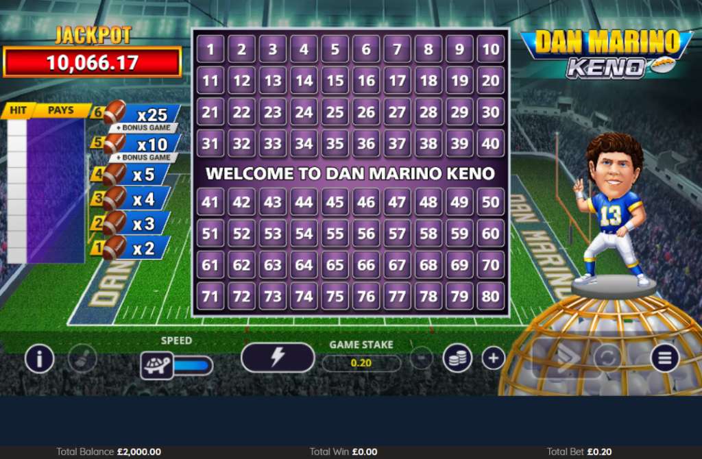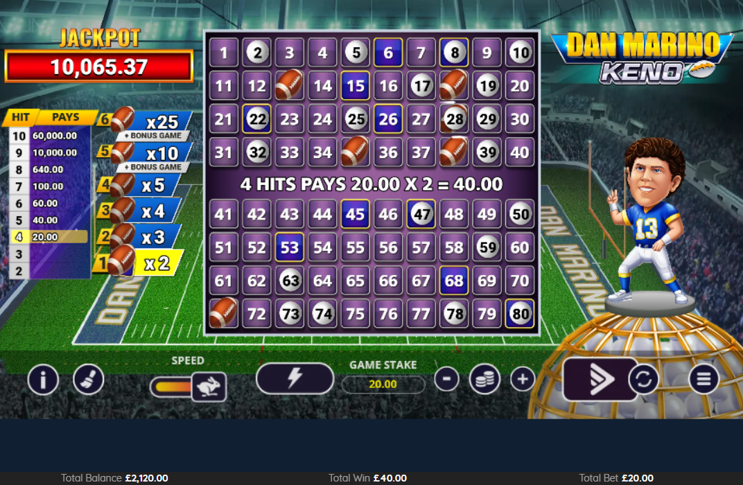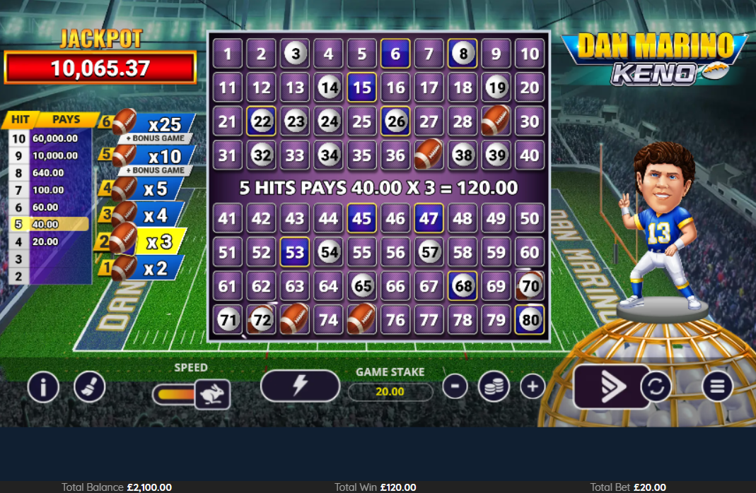 Dan Marino Keno by Pixiu Gaming merges classic lottery gameplay with American football excitement, featuring the NFL legend Dan Marino. The game offers 80 numbers to choose from, with players selecting 2-10 numbers per round while six Ball Bonus symbols add multiplier opportunities to each draw. Dan Marino’s presence extends beyond mere endorsement, as he can throw additional balls onto the grid to enhance winning chances. The Quarterback Challenge bonus feature puts players in direct competition with Marino himself, offering a chance to win the progressive jackpot by reaching 25 points first. The game maintains a medium volatility profile with an RTP range of 80.31% to 94.21%, depending on the number of picks. Players can win up to 75,240x their stake through various features, including the Dan Marino Mini Game with its strategic pick-and-collect mechanics. The progressive jackpot starts at 10,000 and grows with each bet, adding another layer of winning potential to this unique keno variant.
