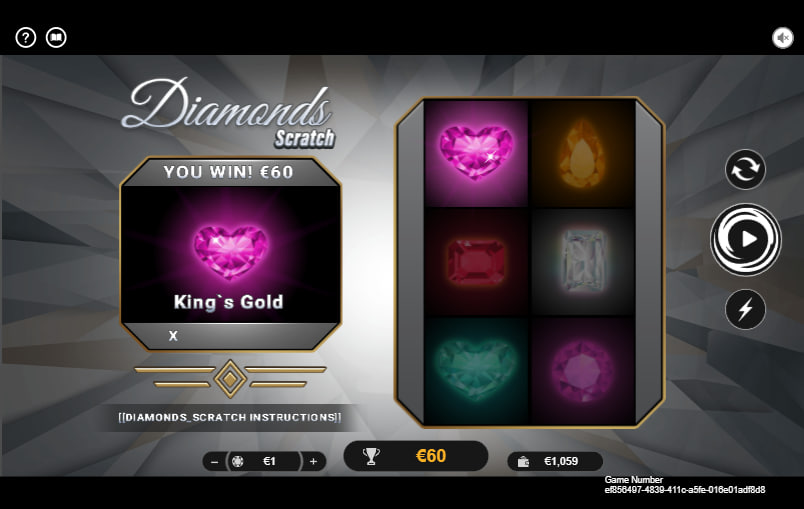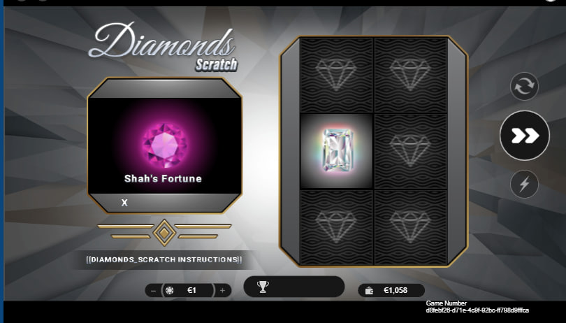 The user interface in Diamonds Scratch is designed for efficiency and minimal obstruction. Key interaction buttons are prominently displayed, typically flanking the main game area. The primary “Play” button initiates the purchase of a new card and the reveal of the reference symbol. For players preferring automation, two distinct options are available. The “Play for Me” button triggers an automated reveal of all six symbols on the current card, bypassing the need for manual “scratching” (which is usually simulated by clicking or dragging the cursor over the covered areas). This streamlines the process for a single game round.