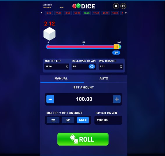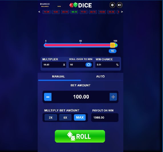 “Dice” provides both manual and auto betting modes, catering to different player preferences. In manual mode, players have granular control over their bet amount, with options to increase or decrease it incrementally. The “Multiply Bet Amount” feature, offering 2x, 5x, and MAX options, allows for rapid adjustments to the stake based on current bankroll and desired aggression. The “Payout on Win” is dynamically calculated and displayed, giving players instant feedback on potential returns.