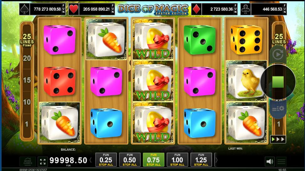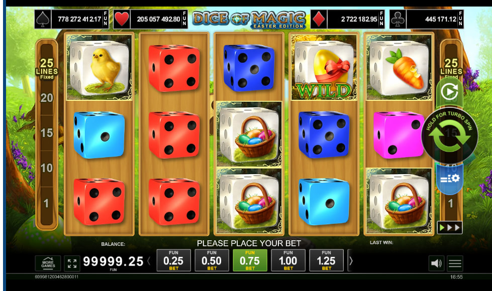 “Dice of Magic – Easter Edition” operates on a 5-reel, 25-fixed payline structure. The paylines are fixed, meaning players wager on all 25 lines with each spin, ensuring consistent coverage across the reel grid. Winning combinations are formed by landing matching symbols on adjacent reels from left to right, starting from the leftmost reel. This is a standard payline mechanic familiar to most slot players.