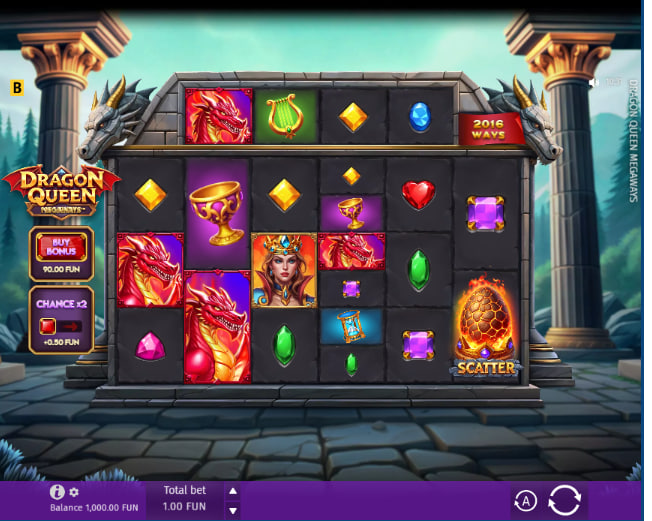 Dragon Queen Megaways by BGaming presents a fantasy milieu dominated by mythical creatures and regal figures. The game operates on a dynamic 6-reel Megaways grid, supplemented by a top horizontal reel, offering up to 200,704 ways to win. Its core gameplay features Refilling Reels, where winning symbols vanish to allow new ones to fall into place. Wild symbols inherently carry an x2 multiplier, enhancing base game payouts. The slot’s high volatility is centered around its potent Free Spins feature. This bonus is initiated by Scatter symbols and commences with a Wheel of Fortune that dictates the number of spins and a starting win multiplier. Successive retriggers award additional spins and, crucially, add to the existing multiplier, creating significant win potential up to 6,000x the stake. Strategic options include a “Buy Bonus” and a “Chance x2” feature.