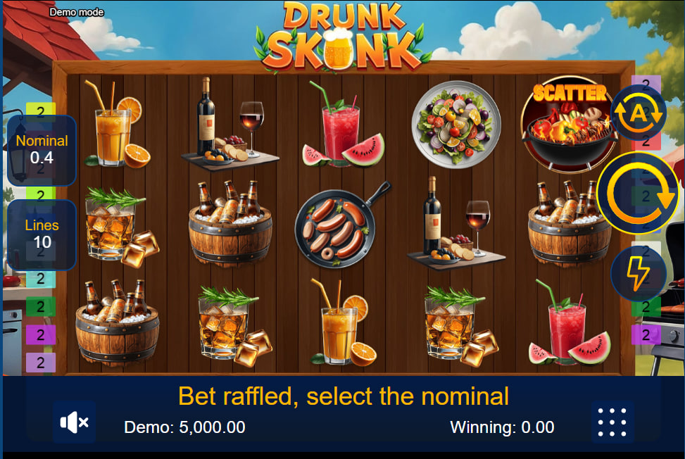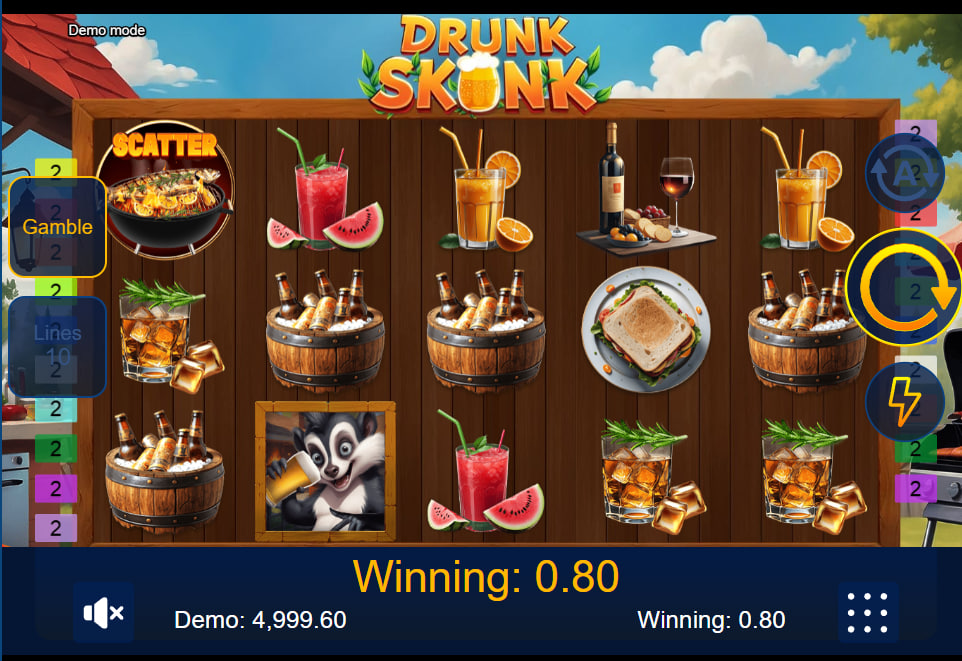 Step into the whimsical world of Drunk Skunk, a culinary-themed slot game developed by SlotoLand. This jovial game centers around a party hosted by a beer-loving skunk, offering a lighthearted and amusing reel-spinning experience. The game showcases cartoon-style food symbols ranging from sandwiches to BBQ grills, creating a playful and inviting atmosphere. Drunk Skunk utilizes a straightforward layout where the main draw is the Free Games bonus feature. Triggered by Scatter symbols, these free spins are enhanced by the Scatter acting as a Wild symbol, potentially increasing win opportunities.