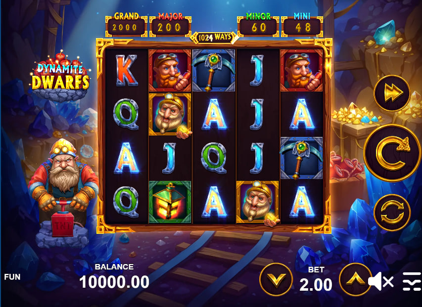 The mining theme, while a familiar trope in slot games, is executed in Dynamite Dwarfs with a commendable level of detail and vibrancy. The backdrop depicts a rich, gem-studded cavern with minecart tracks receding into the depths, creating an immersive, if somewhat conventional, setting.