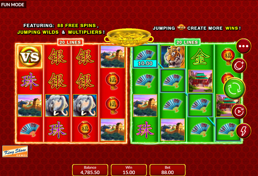 The game employs a unique coin collection mechanism. Specific coin symbols trigger different features. VS coin initiate the Elephants vs Tigers feature, free games coin awards 88 free spins and other various jackpot-specific coins.