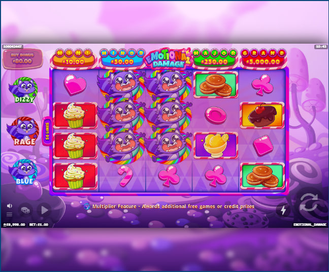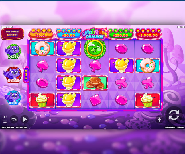 Emotional Damage by Gamevy presents a vivid candy-themed environment populated by expressive monster characters, each integral to its feature set. The game’s atmosphere blends playful visuals with a foundation of complex mechanical interactions. Its base gameplay initiates on a 5×4 reel structure with 50 paylines, which can dynamically expand to a 5×6 grid with 100 paylines during specific bonus rounds. Core mechanics revolve around landing distinct scatter symbols to activate one of three primary bonus features—Dizzy, Rage, or Blue—or their potent combinations. These combined “Super” and “Mega” features significantly alter gameplay, introducing elements like nudging full-reel wilds, win multipliers, and a unique jackpot collection system. With a theoretical RTP of 96.09%, Emotional Damage offers a multifaceted experience. The interplay of these features provides a shifting gameplay landscape. The Rage feature’s letter collection for fixed jackpots adds a distinct objective for players.