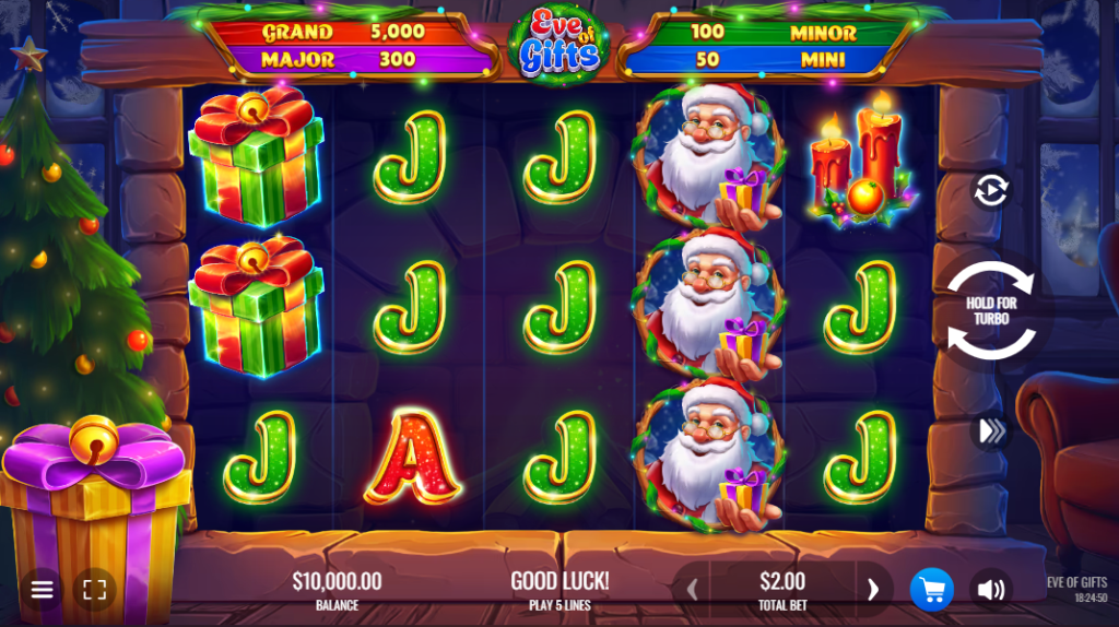 Eve of Gifts by Platipus Gaming presents a festive Hold & Win slot with an innovative collector mechanic. The game features a classic 5×3 layout with 5 fixed paylines, incorporating holiday-themed symbols like bells, candles, and stockings. At its core, the slot combines traditional gameplay with an Extra Bonus collector system that enhances the respins feature. When 6 or more Bonus symbols appear, players enter the respins mode where Extra Bonus symbols can collect values from other symbols on the grid. With an RTP of 96.14% in the base game and four jackpot tiers topped by the Grand Jackpot at 5,000x line bet, Eve of Gifts offers substantial winning potential. The game includes a buy feature option priced at 100x total bet for direct access to the respins feature.