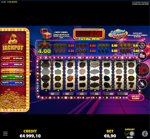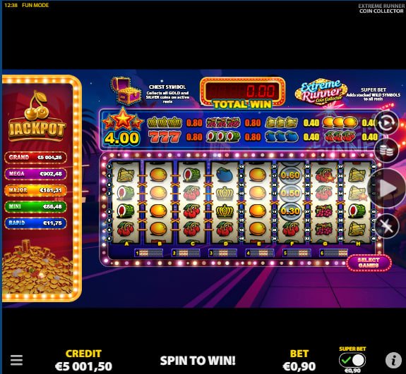 “Extreme Runner Coin Collector” stands out for its innovative approach to player agency and its robust feature set. The ability to scale the game's complexity and payout potential through the SELECT GAMES and SUPER BET options is a significant draw for experienced players seeking a more personalized and dynamic slot session. The Coin Collector mechanic, with its multiplicative potential, provides frequent, engaging wins, while the ever-present possibility of triggering the Golden Cherry Jackpot injects a consistent dose of high-stakes excitement. While the 95.00% RTP is standard for the industry, the game's unique mechanics and the sheer potential for large payouts, particularly through the stacked Wilds and jackpot, make it a compelling choice. This is a slot that rewards strategic play and offers a rewarding experience for those who appreciate a game that evolves with their choices.
