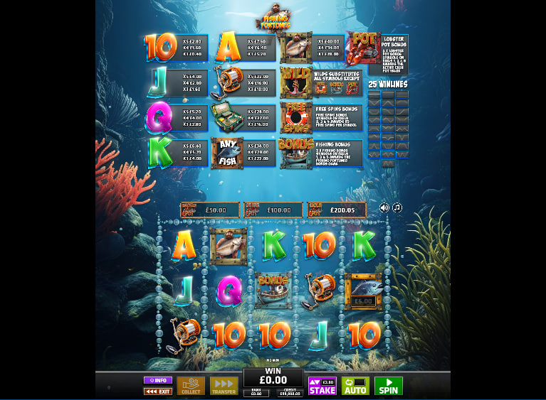 Dive into the tranquil depths with Fishing Fortunes, a slot developed by FatCat. This underwater adventure unfolds on a 5×3 reel layout across 25 fixed paylines, offering a serene yet engaging gameplay experience. The game immerses you in a marine environment, where fishing-themed symbols and classic card ranks populate the reels. Key to unlocking its potential are the thematic bonus features, including the “Lets Go Fishing Bonus,” which awards prizes based on visible fish, and the “Fishing Fortunes Bonus,” a rewarding pick-and-win game. The anchor serves as a Wild symbol, helping to complete winning combinations.