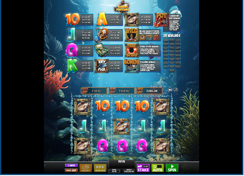 Fishing Fortunes employs a payline structure of 25 fixed winlines. This provides a solid foundation for winning combinations, with payouts awarded for matching symbols appearing from left to right. The symbol hierarchy is a blend of thematic elements and classic card values. The lower-paying symbols consist of brightly colored, stylized card ranks (10, J, Q, K, A). While these might seem standard, their underwater aesthetic, with bubbles and a slight aquatic sheen, adds a touch of thematic consistency.