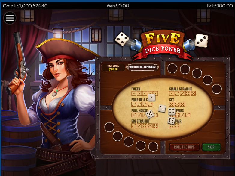 A round in Five Dice Poker commences with the placement of a stake, with parameters ranging from a modest minimum of 1 unit to a maximum of 50 units. Each game round unfolds across a concise two-turn structure. On the initial turn, all five dice are cast. Following this, the player faces a critical decision: which dice to hold, and which to re-roll in pursuit of a stronger combination. Alternatively, a player can elect to ‘Skip' the second roll, standing on their current hand.