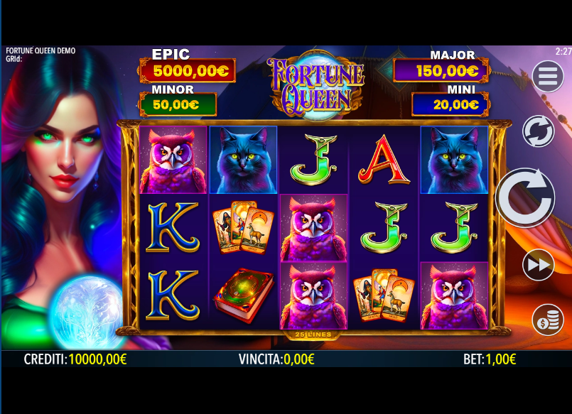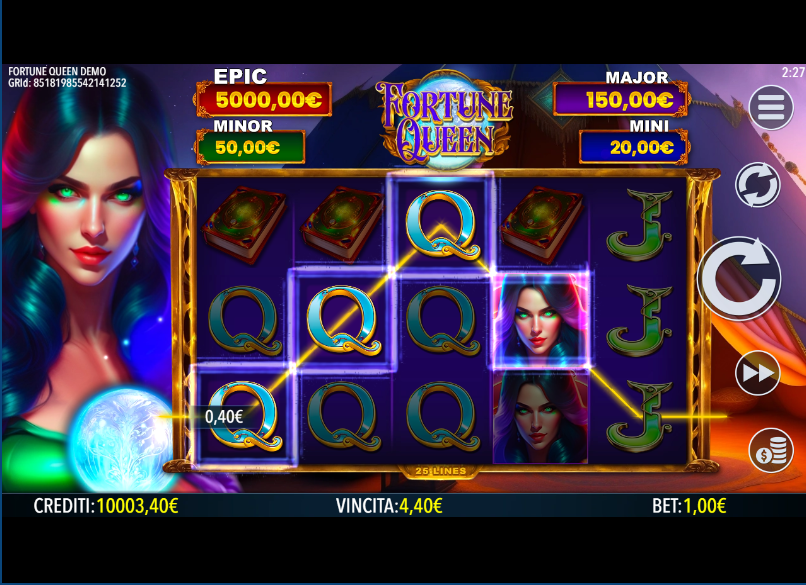 The centerpiece of Fortune Queen is the LOCK'N SPIN feature. This bonus is initiated by landing 6 or more crystal orb Bonus symbols anywhere on the reels during a single spin. Upon activation, the game screen clears of all standard symbols, and the triggering Bonus symbols lock into their positions. These symbols display either a cash value or one of the game's fixed jackpots: Mini, Minor, or Major. The player is then awarded 3 respins. During these respins, only more Bonus symbols or blank spaces can land. Each new Bonus symbol that appears also locks in place and, critically, resets the respin counter back to 3. The round concludes when either the respins are depleted or all 15 positions on the grid are filled with Bonus symbols. If the entire grid is filled, the Epic jackpot is awarded. Otherwise, the values of all landed Bonus symbols are summed up for the total payout.